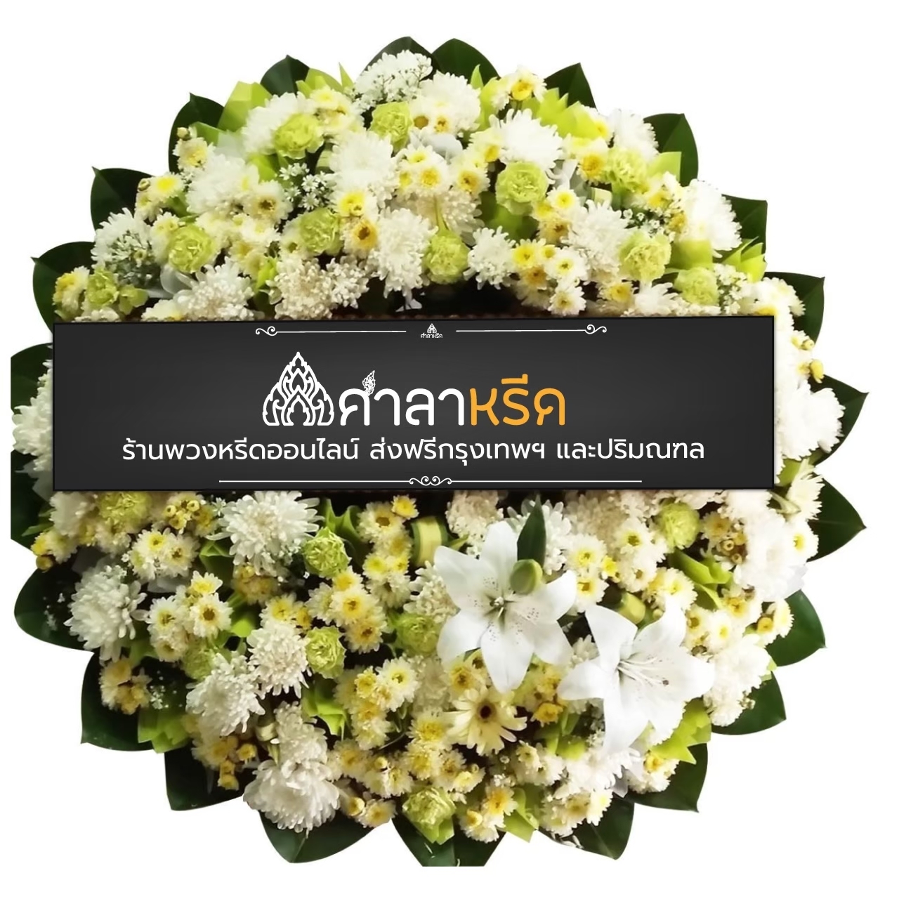 พวงหรีดดอกไม้สดโทนสีเขียว ให้ความรู้สึกผ่อนคลาย สดชื่นความมีชีวิตชีวา และรู้สึกสงบ ตกแต่งด้วยดอกมัม เบญจมาศ ดอกแซม คาร์เนชั่น แซมด้วยลิลลี่พองาม เพิ่มความโดดเด่นด้วยสวอนแพลนท์ เหมาะสำหรับเป็นตัวแทนของความรักความอาลัยอย่างยิ่งยวด
